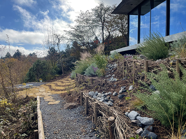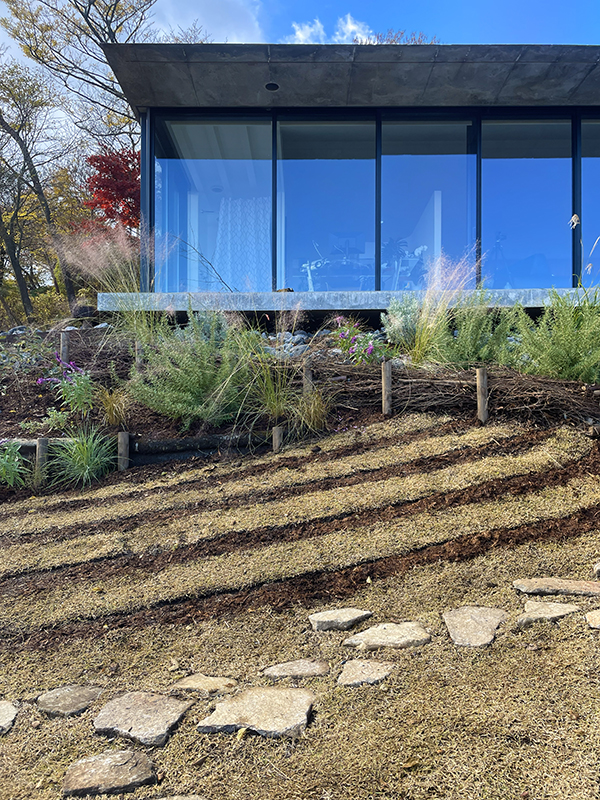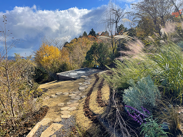 RC造の建物前の法面は現場発生の伐採枝や石で土留めを施し、鹿避けのハーブをメインにグラス類を組み合わせた涼しげな雰囲気の植栽を施しています。