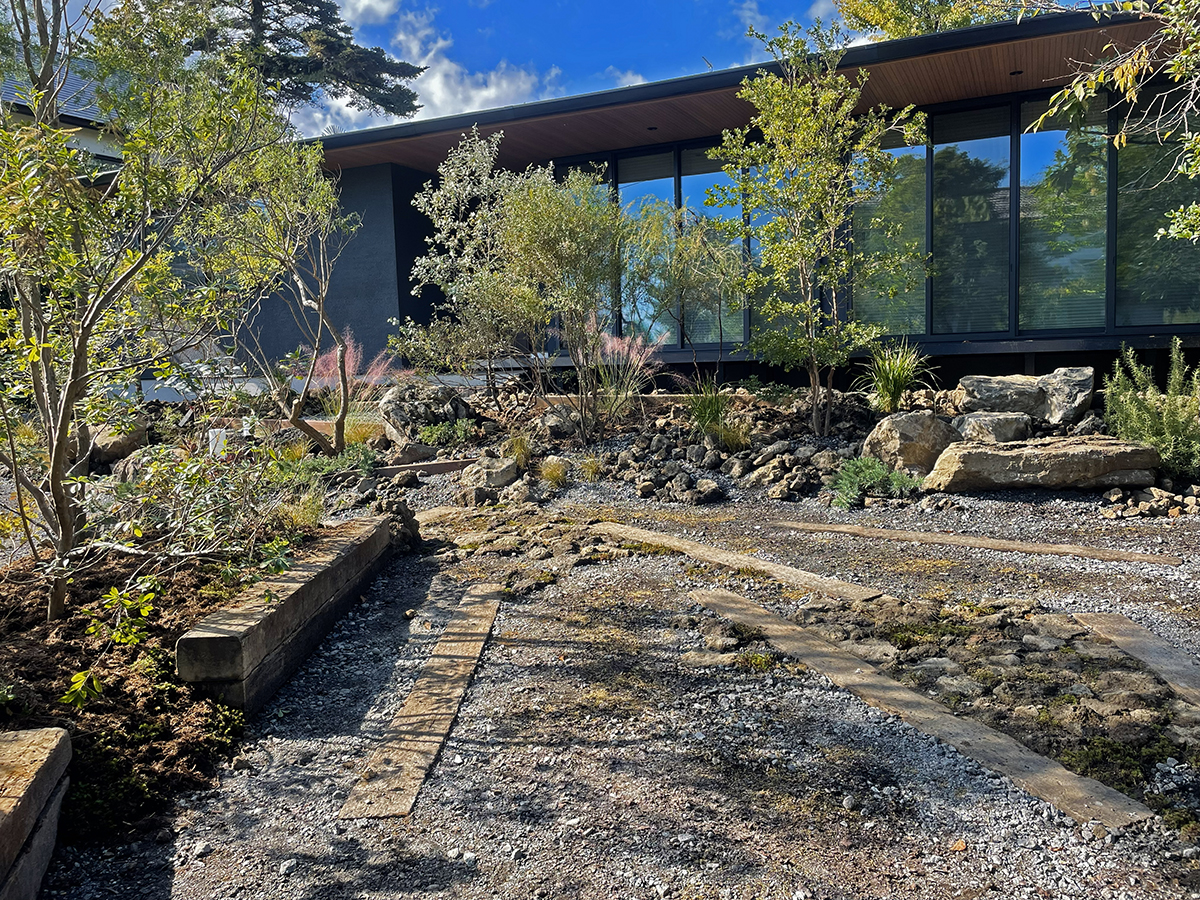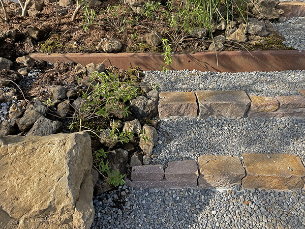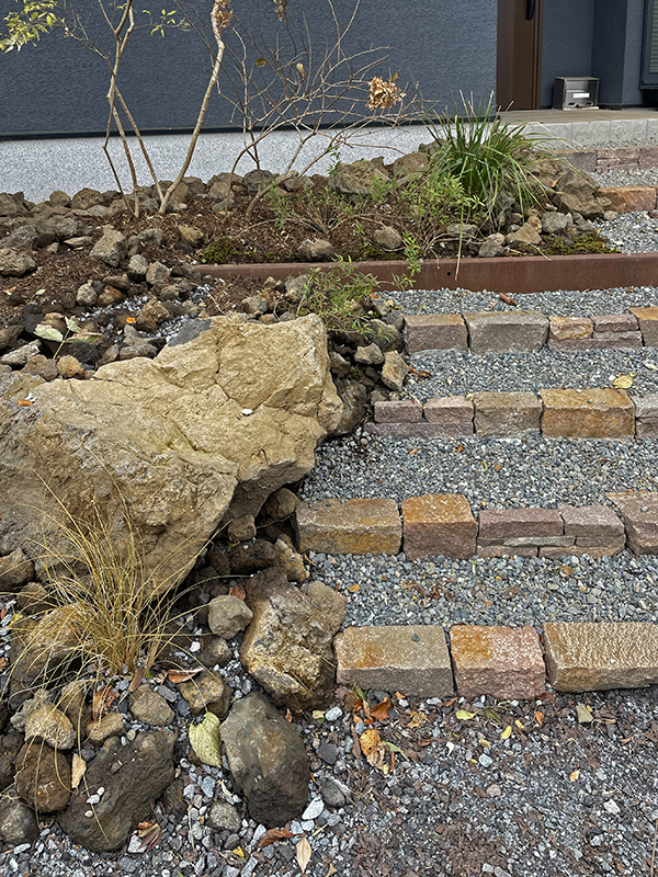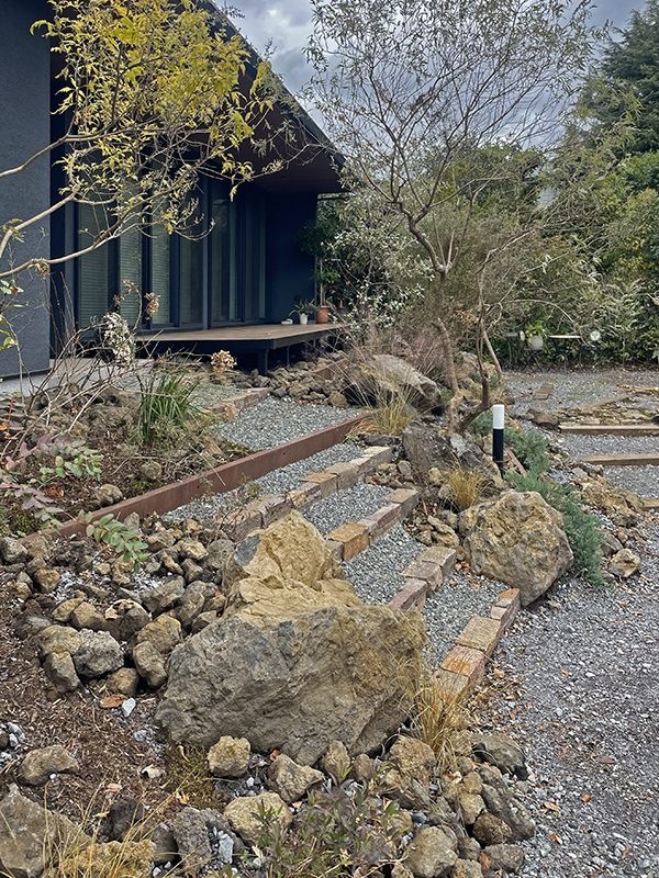 舗装やベンチとして使用した中古枕木や土留めの錆鉄板は風景のアクセントとなりながらも屋外に人の居場所をつくりだし、庭での過ごし方のバリエーションを広げてくれることを期待しています。