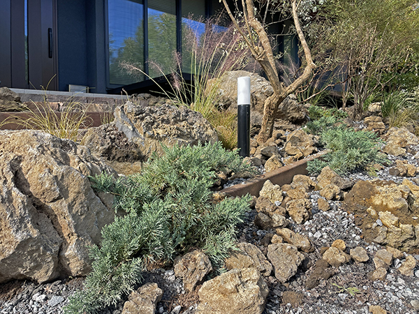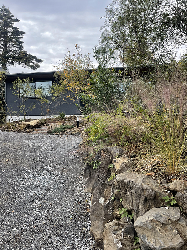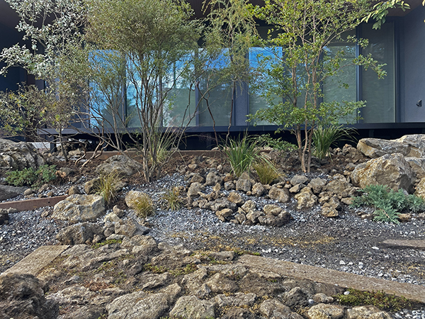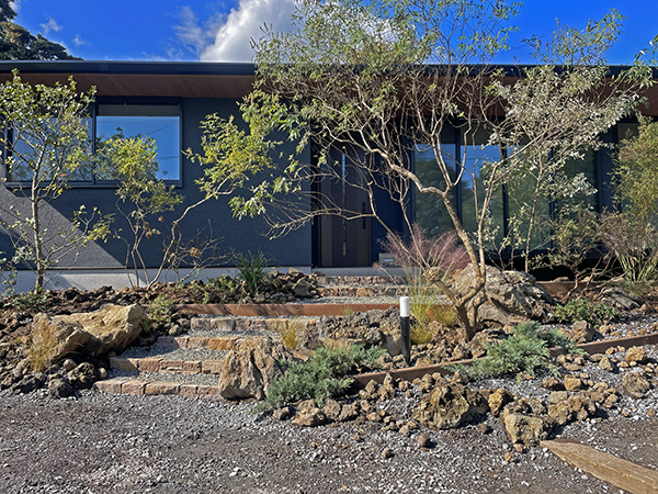 彩り豊かな樹木と風にそよぐグラス類、荒々しい溶岩石に包まれた伊豆の風景を想起させる住宅。