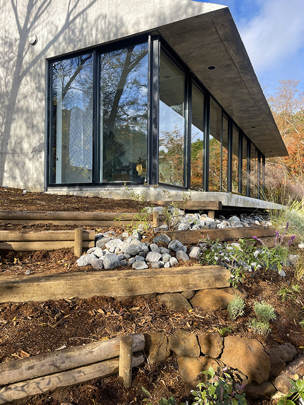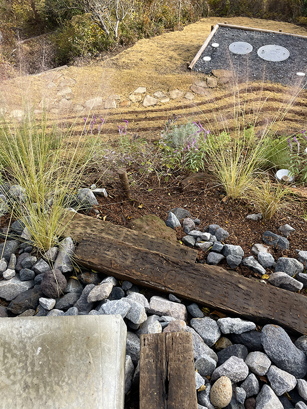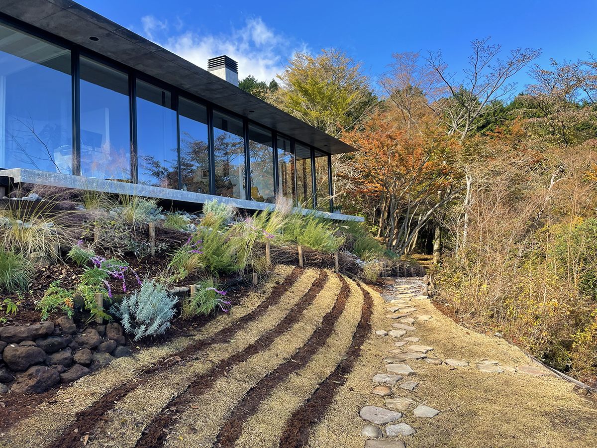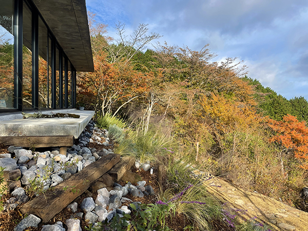 RC造の建物前の法面は現場発生の伐採枝や石で土留めを施し、鹿避けのハーブをメインにグラス類を組み合わせた涼しげな雰囲気の植栽を施しています。