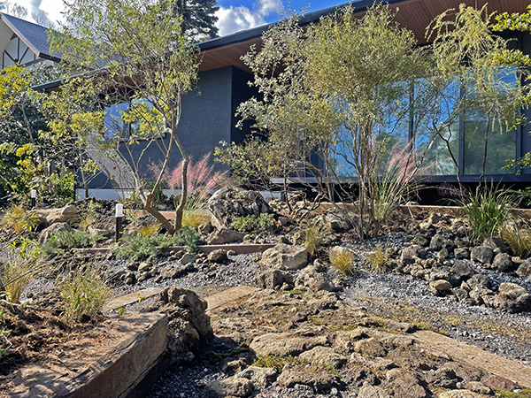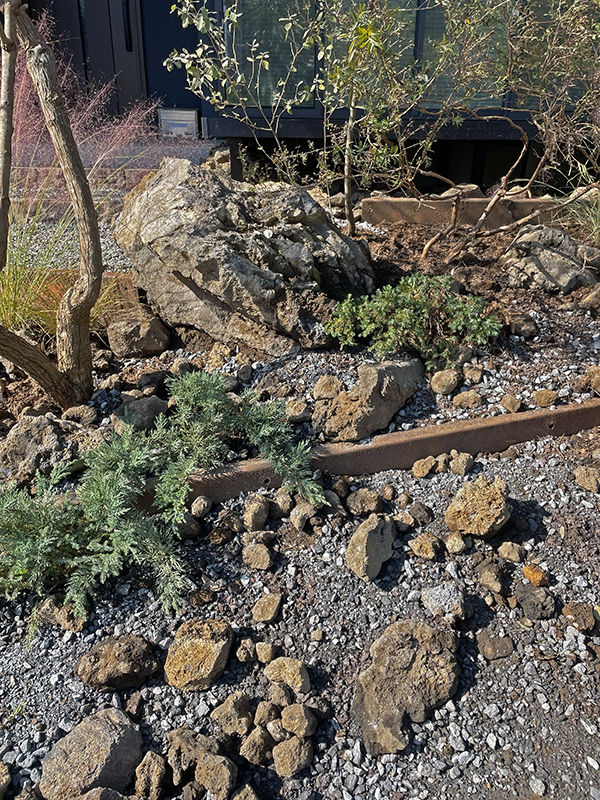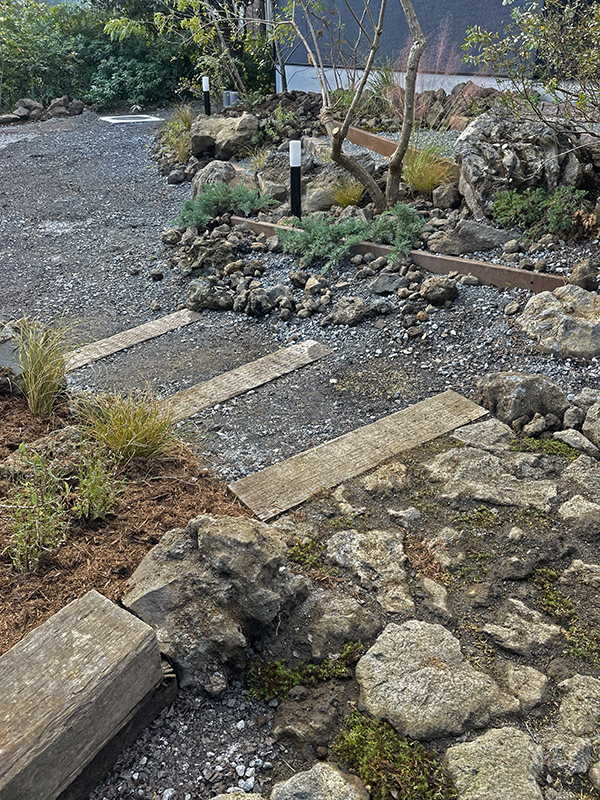 舗装やベンチとして使用した中古枕木や土留めの錆鉄板は風景のアクセントとなりながらも屋外に人の居場所をつくりだし、庭での過ごし方のバリエーションを広げてくれることを期待しています。